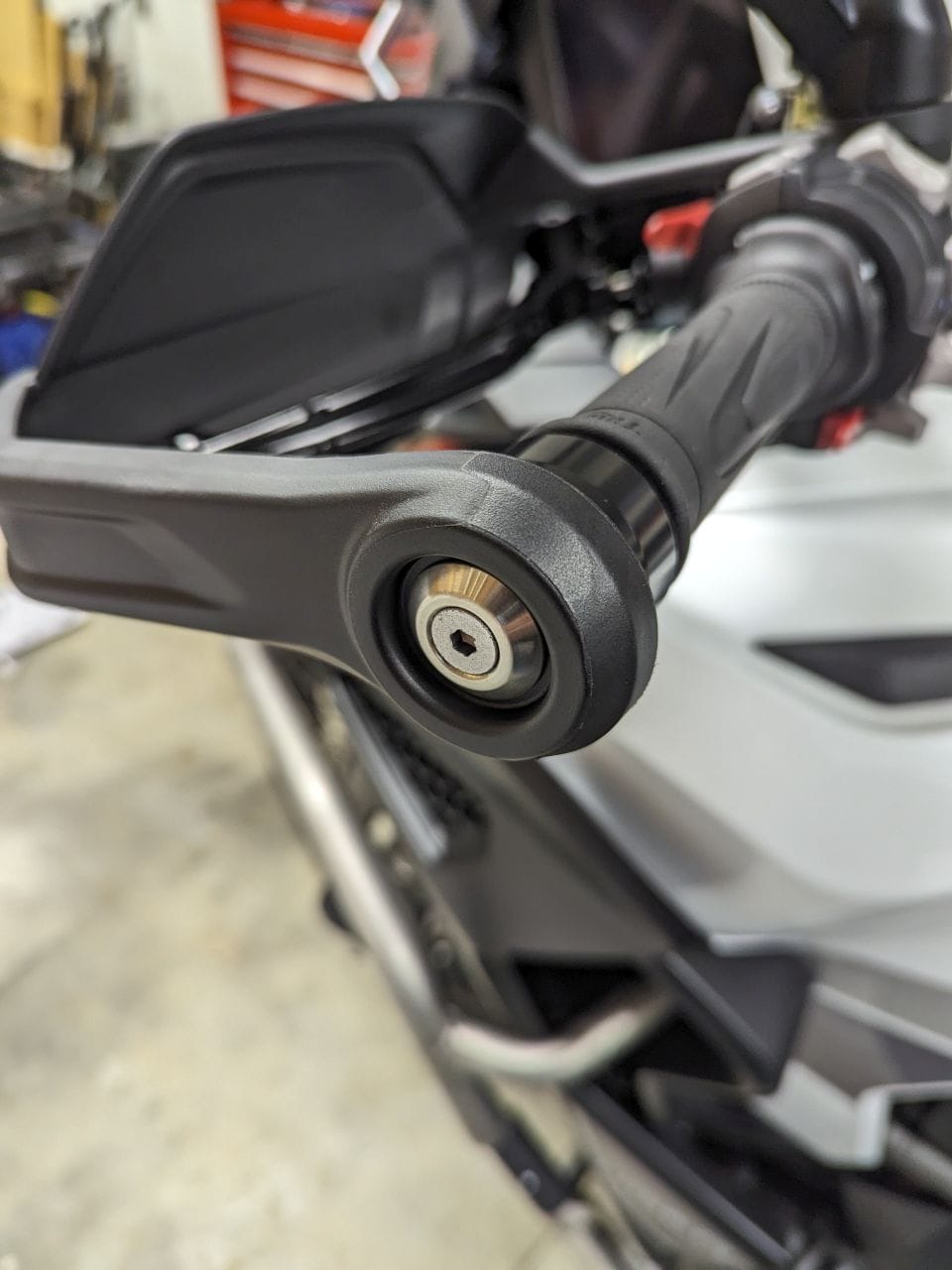 Finally you need to tighten the handlebar end bolt. Move the plastic hand guards to align with the new handlebar guards. Once you have them positioned where you like them, tighten the end bolt to spec.